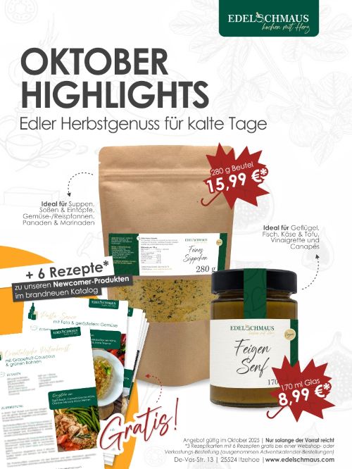 Das Beste für kalte Herbsttage: Unser Feigen Senf vereint den Geschmack süßer Feigen und würzigem Senf. Auch mit unserem Feinen Süppchen im XL-Kraftbeutel kommt der Herbst mit viel Geschmack in den Topf.